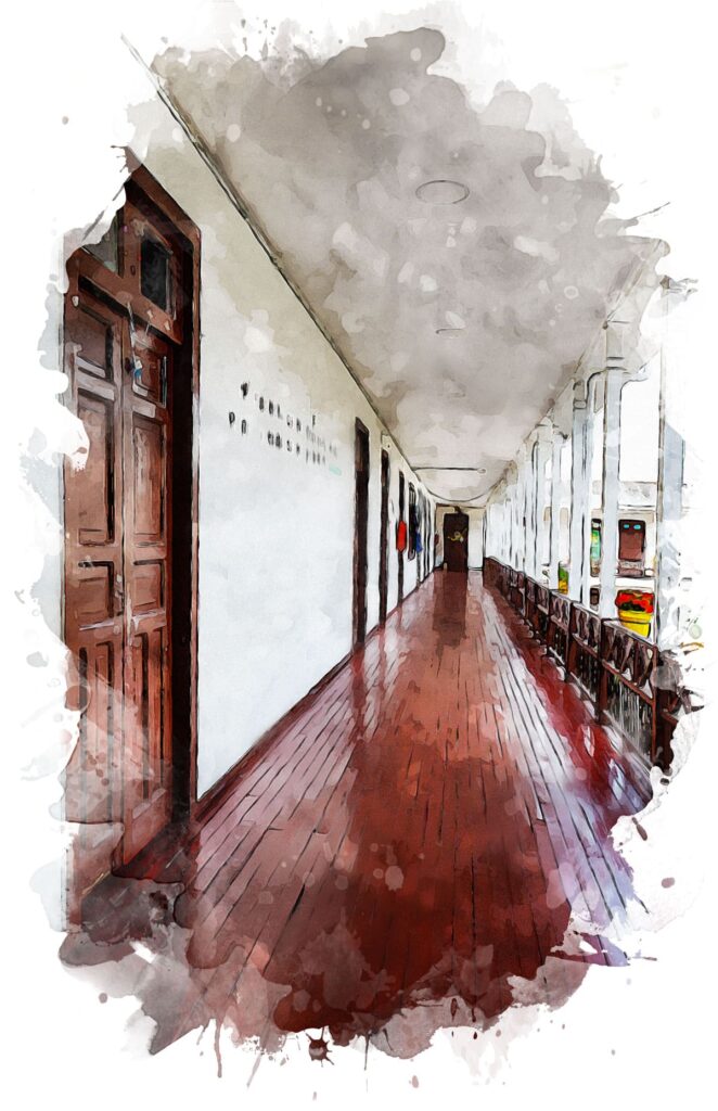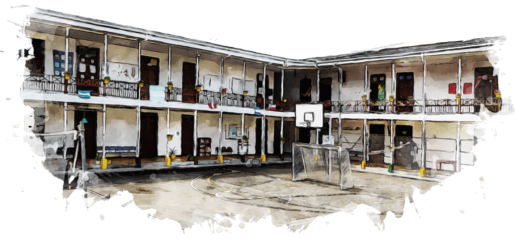 La Escuela La Gran Colombia se impone como una presencia destacada en su entorno urbano, ocupando una porción considerable de la manzana del barrio San Joaquín. Su diseño arquitectónico en forma de “U” se desarrolla en torno a un amplio patio central, enmarcado por una columnata en madera que otorga carácter y ritmo al espacio. La edificación construida en mampostería y con dos niveles se adapta con ingenio a la topografía inclinada del terreno, lo que le otorga una jerarquía visual y formal dentro del conjunto urbano y la destaca en el tradicional barrio de la comuna Cumanday.