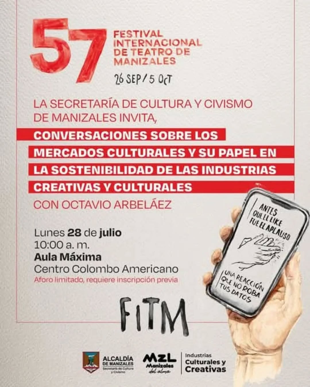 La Secretaría de Cultura y Civismo de Manizales y el Festival Internacional de Teatro de Manizales te invitan a una conversación imperdible sobre los mercados culturales y su rol en las industrias creativas, con Octavio Arbeláez.