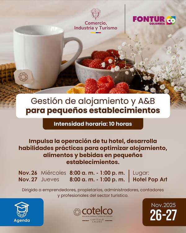 Estimados afiliados, Los invitamos a participar de esta formación diseñada en alianza con COTELCO Nacional para fortalecer la gestión de sus establecimientos, brindando herramientas para optimizar las operaciones de recepción, habitaciones, alimentos y bebidas. Fecha: 26 y 27 de noviembre de 2025 Hora: 8:00 a.m. – 1:00 p.m. (ambos días) Lugar: Hotel Pop Art Intensidad […]